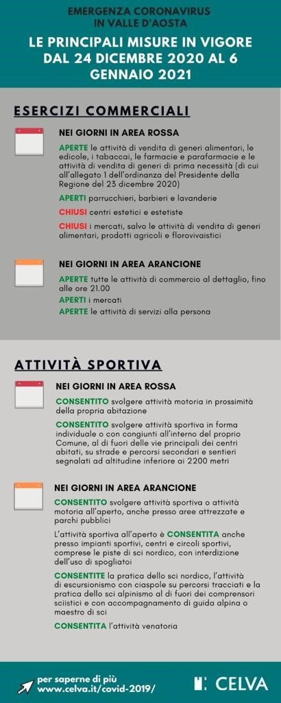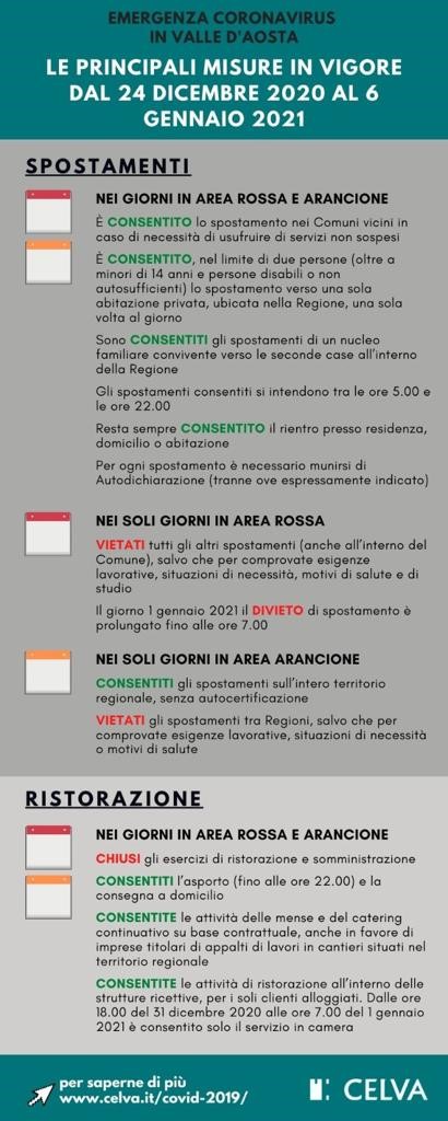 Dal 24 dicembre 2020 al 6 gennaio 2021 in Valle d'Aosta si applicano le misure previste dal D.L. 172/2020 e dall'ordinanza del Presidente della Regione Autonoma Valle d'Aosta del 23 dicembre 2020.