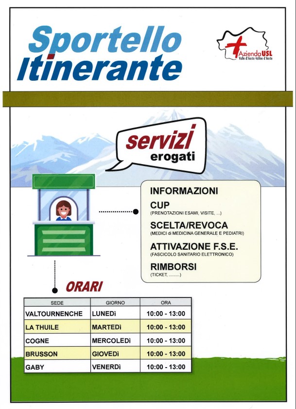Lo sportello itinerante dell'AUSL sarà a Gaby il venerdì mattina dalle ore 10 alle ore 13.00 ed erogherà i seguenti servizi: