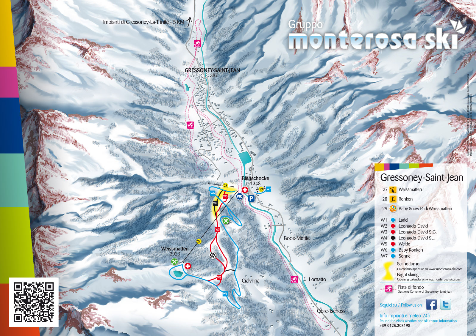 Il Monterosa Ski unisce tre valli alpine in un unico comprensorio sciistico, al cospetto del massiccio del Monte Rosa, tra la Valle d’Aosta ed il Piemonte. 180 chilometri di piste e 6 località alpine (Antagnod, Alagna, Brusson, Champoluc-Frachey, Gressoney-La-Trinité, Gressoney-Saint-Jean) accessibili con un unico biglietto, collegano tra loro le valli supportate da più di 400 punti di alimentazione dei cannoni per l’innevamento artificiale, impianto che garantisce la possibilità di sciare su circa 170 km di piste anche in periodi di scarse precipitazioni nevose.